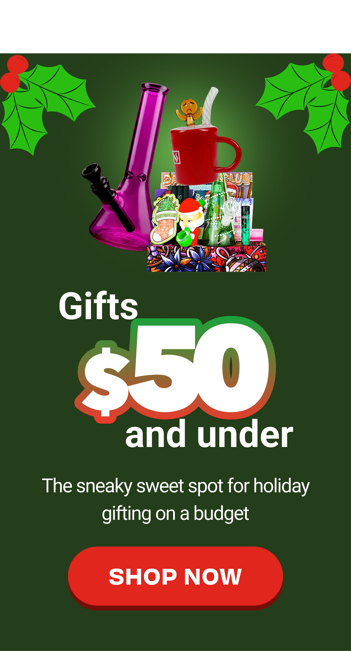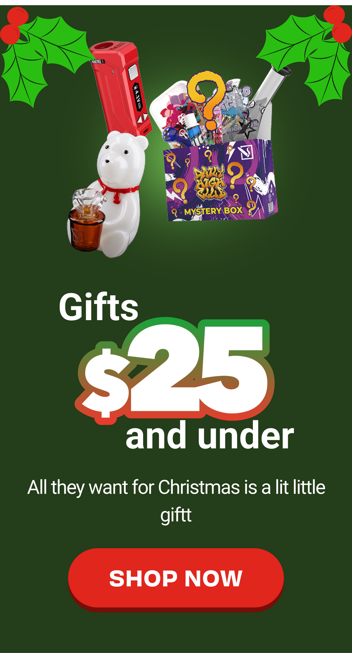 Daily High Club's 2025 Christmas gift guide packs the best cannabis gifts for every budget—cheap stocking stuffers under $25, solid bongs and dab rigs under $50, top-shelf e-rigs and dry herb vapes under $100, plus splurge-worthy gear for anyone who treats their setup like a shrine. Shop hand pipes, quartz bangers, beaker bongs, mini rigs, bubblers, PAX vapes, Puffco Peak Pro, GRAV glass, and holiday smoking accessories from brands that actually rip. Whether you're hunting affordable weed gifts that won't leave you dankrupt or ready to drop coin on a Volcano Hybrid, this collection brings the gear stoners actually want. Find glass pipes, grinders, rolling trays, glow-in-the-dark pieces, mushroom bongs, artist glass from Empire Glassworks and Hemper, and e-rigs that hit clean and look fire. Perfect for Secret Santa, the homies, or yourself. Built by stoners for stoners since 2015—grab the best smoking accessories and cannabis gifts this holiday season. Fast shipping on all orders.