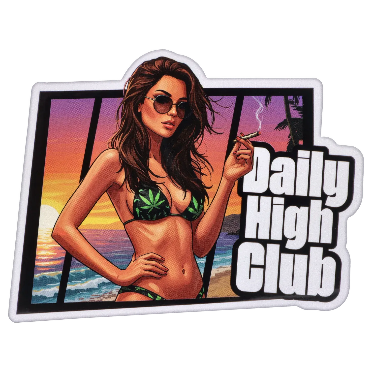 • A sun-soaked bikini girl set against bold Daily High Club lettering for beach-meets-street energy