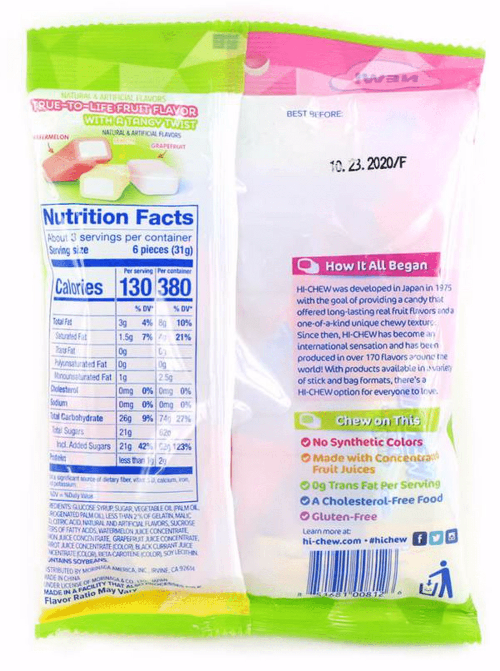 The Morinaga Hi-Chew Fruity Chewy Candy is a type of chewy candy that features a combination of fruit flavors. This product offers a unique taste experience with its blend of watermelon, lemon, and grapefruit flavors.